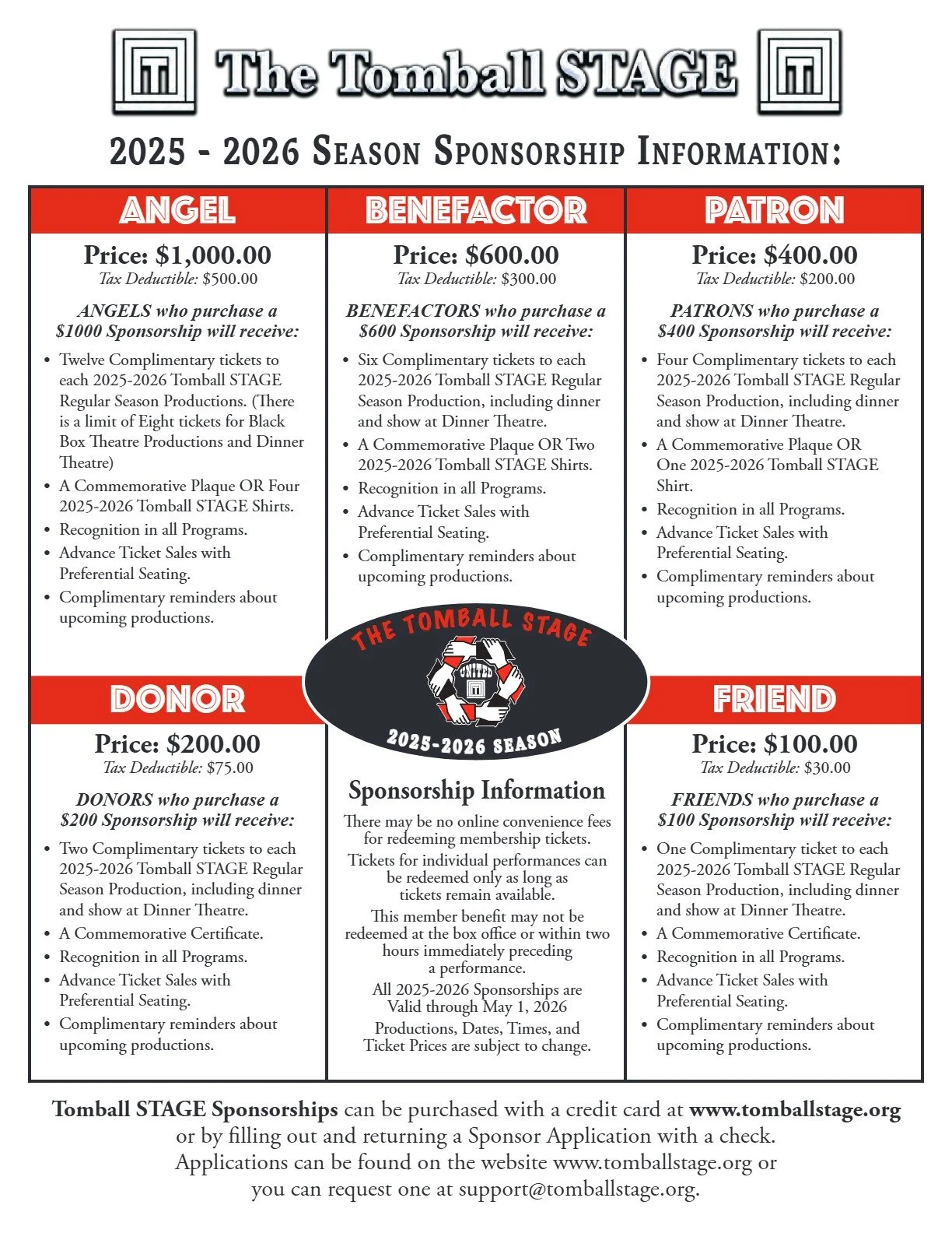 We endeavor to find something for everyone in our Season of Productions and hope that you will join us in celebrating the art of Theatre together at Tomball STAGE. All productions will be performed in the Tomball High School Auditorium or the Black Box Theatre. You can purchase Season Tickets for our Productions by purchasing a Sponsorship on our website, tomballstage.org. Individual tickets, dates, times, prices, can also be found on our site.